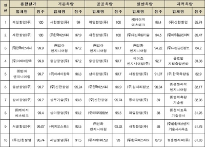 기본, 공공, 일반 및 지적측량 분야별로 점수를 산정하면 기본측량은 새한항업㈜, 공공측량은 제일항업㈜, 일반측량은 ㈜케이지에스테크, 지적측량은 ㈜신한항업이 각각 1위를 차지했다.