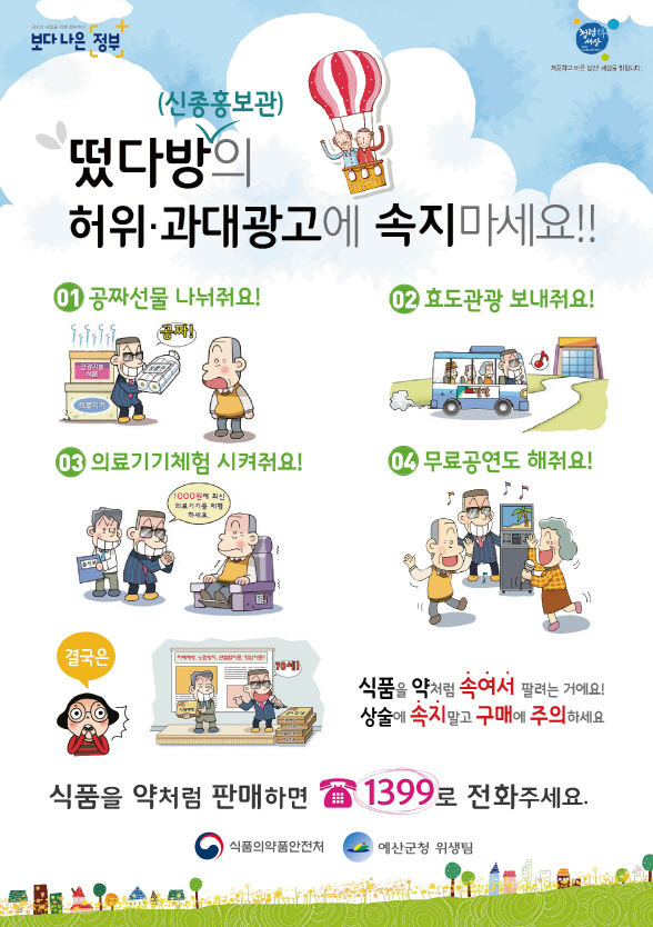군 관계자는 “식품 등이 질병치료에 특효가 있다고 광고하는 것은 명백한 위반행위”며 “이러한 불법 판매 행위를 목격할 경우 부정불량식품 신고센터 또는 군청 교육체육과 위생팀으로 신고해주기 바란다”고 당부했다.