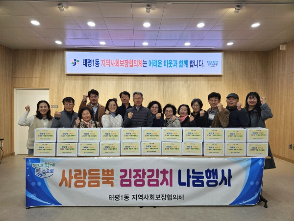 [충청뉴스큐] 대전 중구 태평1동은 지난 18일 지역사회보장협의체 주관으로 관내 저소득 취약가구를 위한 사랑의 김장 나눔 행사를 개최했다고 밝혔다 이날 태평1동 지역사회보장협의체 회원들은 관내 홀몸 어르신 등 어려운 이웃 22가구에 김장김치를 전달하며 지속적인 이웃사랑을 실천했다.