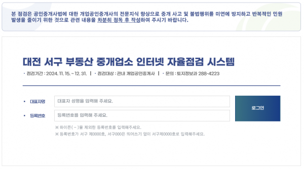 [충청뉴스큐] 대전 서구는 전세사기 등 불법행위를 방지하고 직업윤리 및 전문 역량을 강화해 중개서비스 품질을 높이기 위해 오는 12월 31일까지 관내 부동산 중개업소 1,100여 개를 대상으로 부동산 중개업소 인터넷 자율점검을 실시한다.