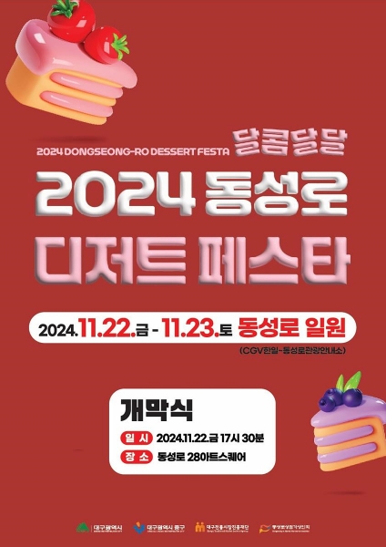 [충청뉴스큐] 대구광역시는 동성로 일원에서 ‘동성로에서 즐기는 디저트’라는 주제로 11월 22일부터 23일까지 양일간 동성로 소상공인을 위한 ‘2024년 동성로 달콤달달 디저트 페스타’를 개최한다.