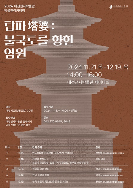 [충청뉴스큐] 대전선사박물관은 21일부터 박물관아카데미‘탑파塔婆: 불국토를 향한 염원’을 운영한다.