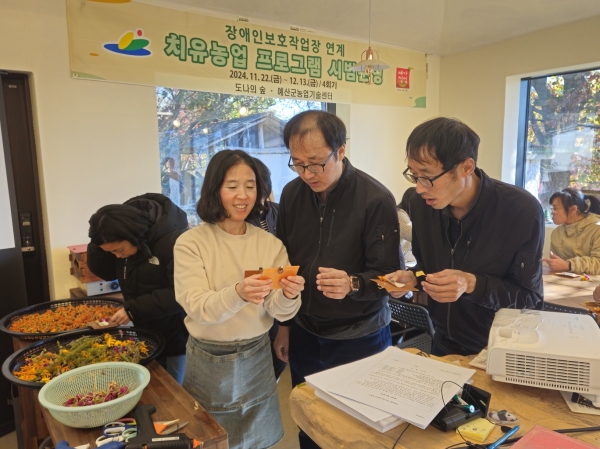 [충청뉴스큐] 예산군농업기술센터는 지난 22일 도나의 숲 농장에서 예산군장애인보호작업장과 연계한 다회차 치유농업 프로그램을 시범 운영했다.