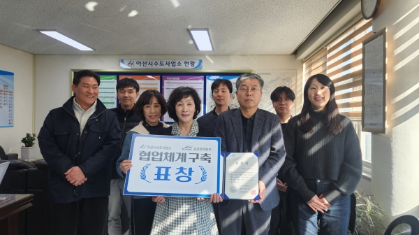[충청뉴스큐] 아산시 수도사업소가 k-water 천안권지사와 용수공급 협업체계를 구축하는 데 기여한 공을 인정받아 K-water 금강유역본부로부터 표창을 받았다.