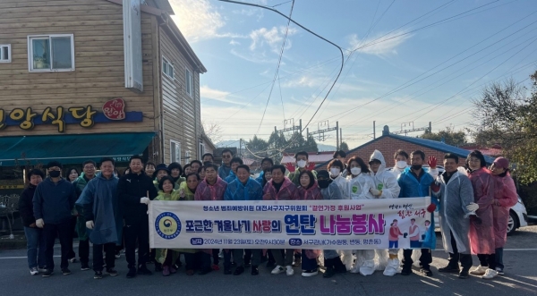 [충청뉴스큐] 대전 서구는 지난 23일 청소년 범죄예방위원 대전서구지구위원회 회원 30여명과 함께 추운 겨울철 따뜻한 이웃사랑을 실천하기 위해 독거어르신 세대 7가구에 사랑의 연탄 2,700여 장을 전달했다.