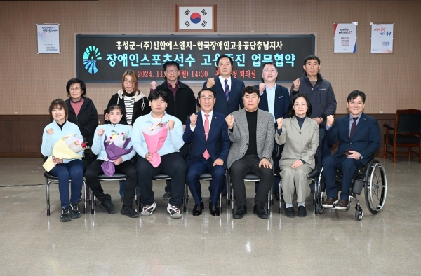 홍성군은 장애인스포츠 선수들의 안정적인 경제활동 기반 구축을 위해 25일 ㈜신한에스엔지, 한국장애인고용공단과 ‘장애인스포츠선수 고용증진을 위한 업무협약’을 체결했다.