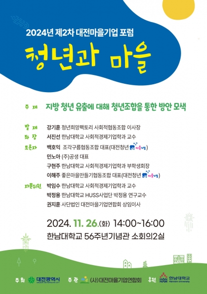 [충청뉴스큐] 대전시는 26일 한남대학교 56주년 기념관에서 ‘2024년 제2회 대전 마을기업 포럼: 청년과 마을'을 개최한다.