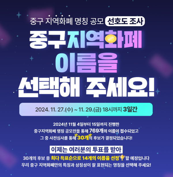 지역화폐에 대한 주민들의 이해와 공감대를 형성하고 보다 매력적인 명칭을 찾기 위해 마련된 이번 공모전은 11월 4일부터 15일까지 접수된 총 769건의 작품 중 중구청 자체 사전심사를 거쳐 30개 후보작을 선정했으며 국민 선호도 결과를 통해 14개 후보를 추린 뒤, 중구사랑상품권 발행위원회에서 최종 순위를 결정할 예정이다.