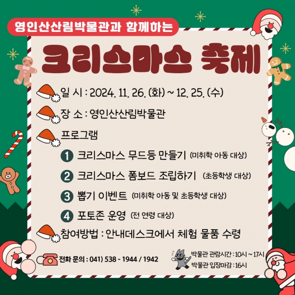 [충청뉴스큐] 아산시시설관리공단 영인산산림박물관은 크리스마스를 맞이해 11월 26일부터 12월 25일 크리스마스까지 한 달간 즐거운 추억을 남길 수 있는 다채로운 체험 이벤트를 진행한다고 밝혔다.