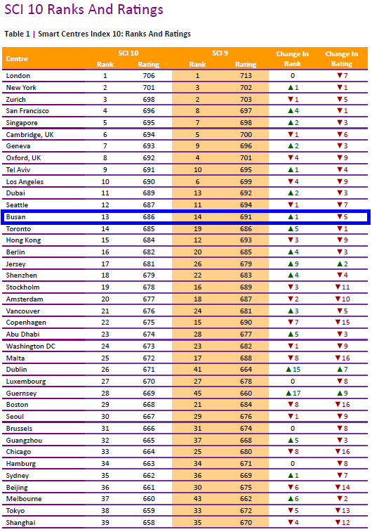 아시아에서는 처음으로 홍콩을 제치고 싱가포르에 이어 2위를 달성함으로써 명실상부 ‘아시아 상위2 지능형도시’로 자리 잡았으며 서울은 지난 회차에 비해 1단계 하락한 30위로 부산이 국내 1위 역시 굳건히 유지했다.