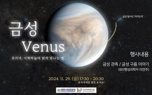 [충청뉴스큐] 대전시는 29일 저녁 5시 30분부터 8시 30분까지 대전시민천문대에서 ‘기초과학연구원과 함께하는 금성관측회와 강연회’를 개최한다.
