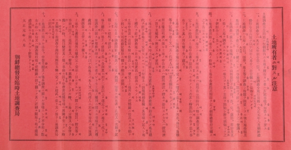 토지조사사업의 핵심을 보여주는 자료로 당시 토지조사사업의 중요성을 나타내듯 빨간 종이에 인쇄됐다.