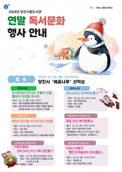 [충청뉴스큐] 당진시립도서관은 연말을 맞아 12월 한 달간 흥미롭고 재미있는 공연과 프로그램으로 구성된 연말 독서문화행사를 진행한다.