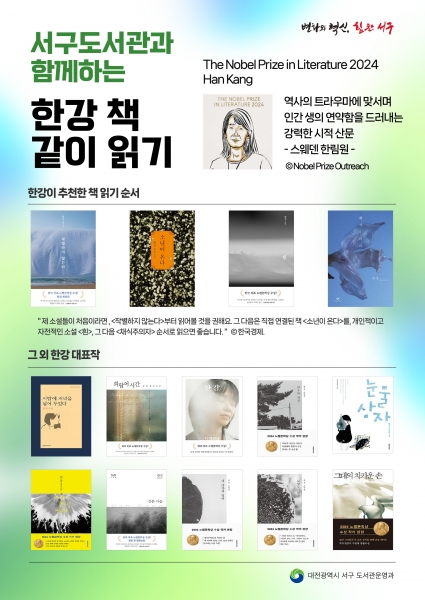 [충청뉴스큐] 대전 서구 공공도서관은 한국 최초로 노벨문학상을 수상한 한강 작가를 기념하고자 오는 12월 1일부터 31일까지 ‘한강 작가 도서 특별전시’를 운영한다.