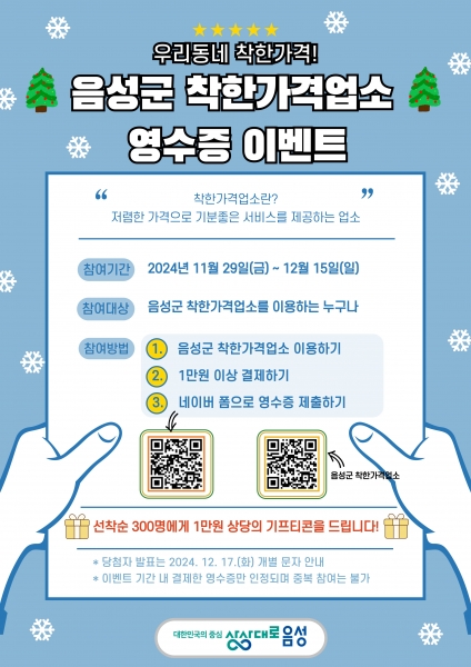 [충청뉴스큐] 음성군은 어려운 경제 상황에도 착한가격으로 지역 물가안정에 기여하고 있는 음성군 착한가격업소 활성화를 위해 29일부터 다음 달 15일까지 영수증 이벤트를 진행한다.