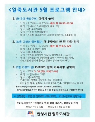[충청뉴스큐] 안성시 일죽도서관은 5월 가정의 달을 맞아 영·유아대상 동화구연 ‘이야기놀이’, 초등영어특강 ‘애니메이션 한 편 따라 하기’, ‘PUCO와 함께 가족사랑 음악회’ 등 온가족 맞춤 프로그램을 운영한다.