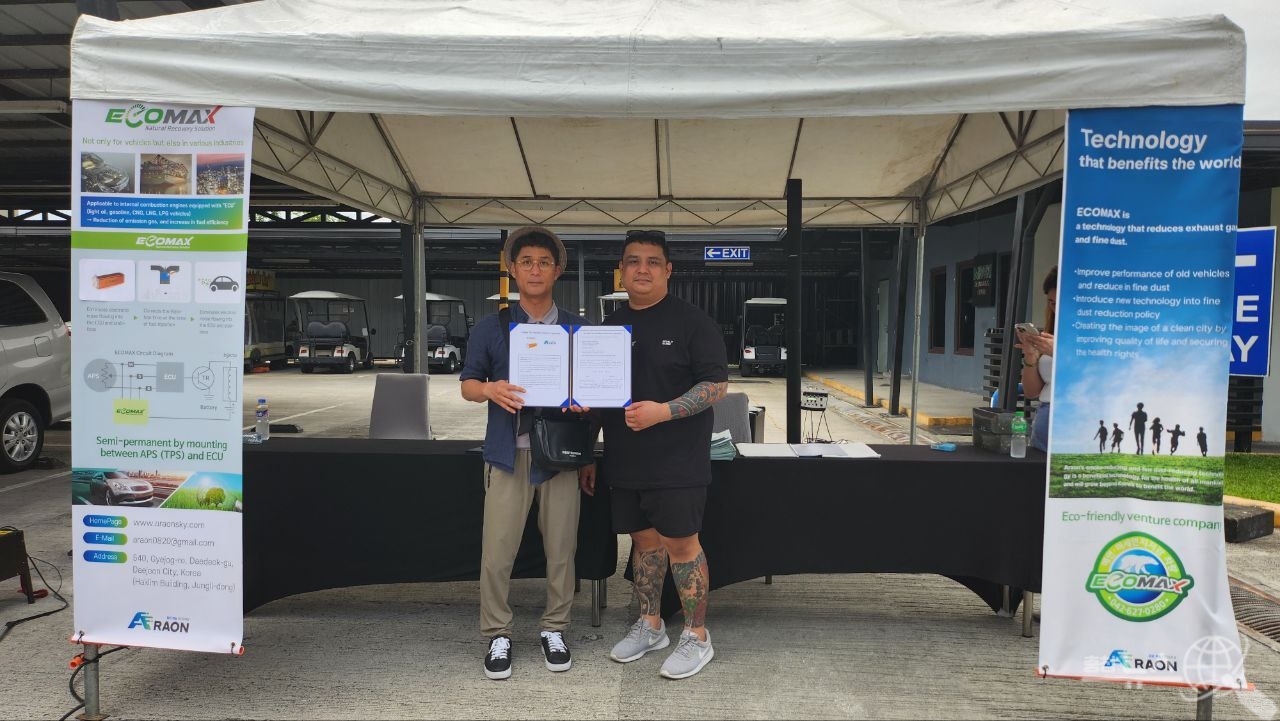 조달청 혁신제품인 자동차 매연·미세먼지저감장치 ‘에코맥스 플러스’를 제조하는 대전시 벤처기업 ㈜아라온(대표이사 강재인)이 필리핀 민관 협동 시연회를 통해, 대리점 두 곳 계약과 3천불 수출 계약까지하는 성과를 이뤘다고 한다.