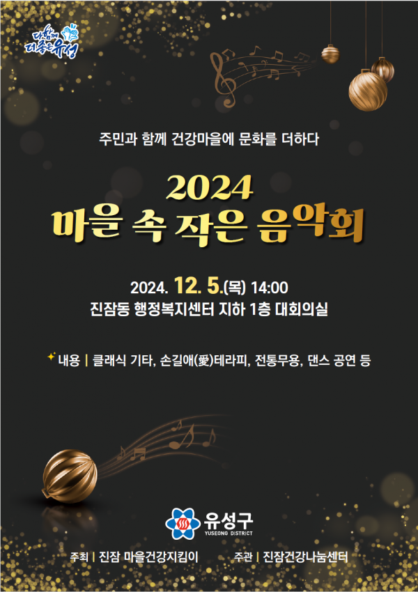 이번 음악회는 마을건강지킴이 주민들이 주최하고 진잠건강나눔센터에서 주관하는 행사로 건강동아리인 클래식 기타, 손길애테라피, 주민 노래자랑, 전통무용, 진잠초등학교 풍물놀이, 방송댄스 등 다채로운 공연이 펼쳐질 예정이다.