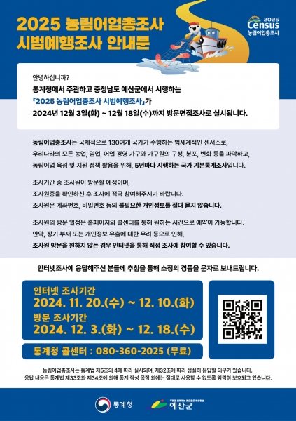 [충청뉴스큐] 예산군은 12월 3일부터 18일까지 16일간 2025 농림어업총조사 시범 예행 조사를 실시한다.