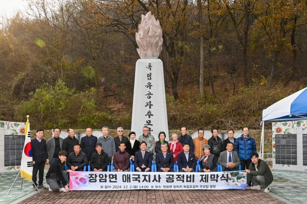 [충청뉴스큐] 부여군은 지난 2일 장암면 장하리 독립유공자 추모탑 광장에서 장암면 출신 강주구, 강병욱, 남상만 애국지사의 공적비 제막식을 거행했다.