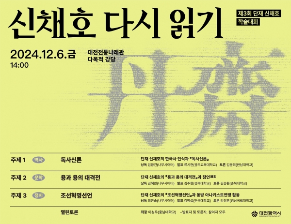 [충청뉴스큐] 대전시는 단재 신채호 선생 탄신 제144주년을 맞아 6일 대전전통나래관에서 ‘제3회 단재 신채호 학술대회’를 개최한다.