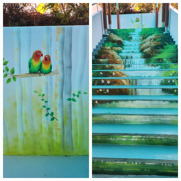 계단은 4차선 도로변에서부터 학교까지 내려오는 총 2층 형태로 나무 및 바위와 꽃과 폭포가 어우러지는 형상을 담고 있다.