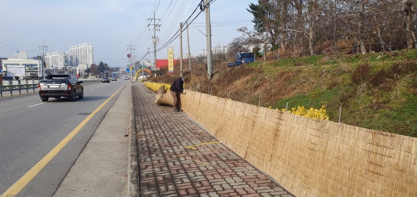 군 관계자는 “올겨울 강추위가 예고된 만큼 특색있는 가로환경 조성을 위해 식재된 황금사철나무가 동해를 입지 않도록 방풍벽 설치에 최선을 다하고 있다”며 “가로수 뿐만 아니라 공원 시설물에 대해서도 동절기를 대비한 퇴수 작업 등 유지관리를 위해 최선을 다하겠다”고 말했다.