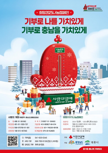 [충청뉴스큐] 계룡시는 충남사회복지공동모금회와 함께 지난 12월 1일 시작한 ‘희망2025 나눔캠페인’ 성금 모금을 내년 1월 31일까지 62일간 실시한다고 밝혔다.