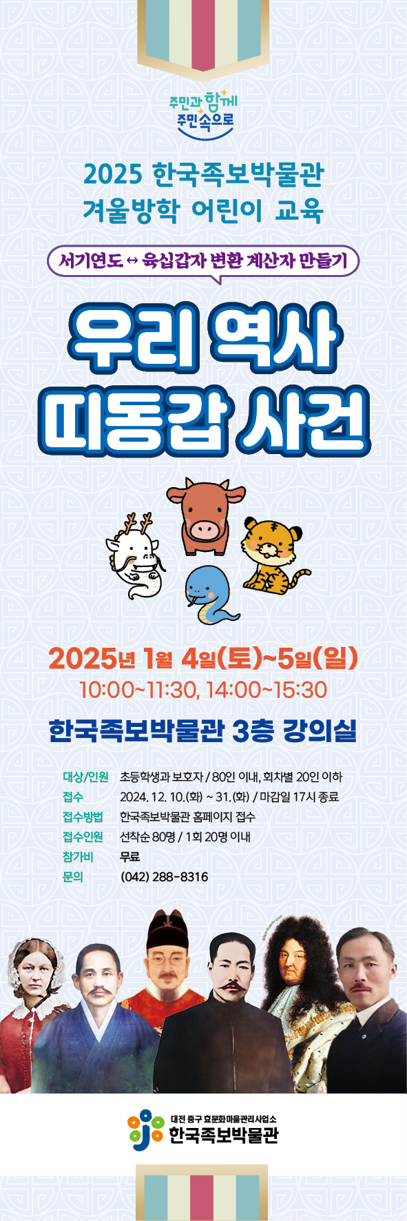 [충청뉴스큐] 대전 중구는 한국족보박물관에서는 겨울방학을 맞아 어린이들에게 우리 역사 속 중요한 사건을 재미있게 배울 수 있는 ‘우리 역사 띠동갑 사건’ 프로그램을 운영한다고 밝혔다.