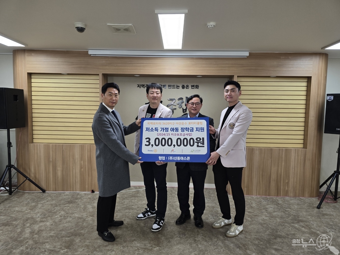 아산온수 로타리클럽은 2022년 3월 창립되었으며, 적극적인 지역봉사를 실천하고 있는 단체이다. 이번 후원은 ㈜신동아스콘의 협업을 통해 진행되었으며, 아산시의 저소득 가정 아동들에게 교육 기회를 제공하고, 그들의 꿈과 희망을 지원하기 위해 마련되었다. 후원금은 굿네이버스 온주종합사회복지관을 통해 저소득 가정 아동들에게 장학금으로 지원될 예정이다.
