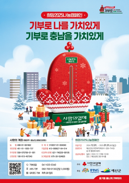 [충청뉴스큐] 예산군은 지난 1일부터 시작한 희망 2025 나눔 캠페인에 각 기관단체 및 군민의 뜨거운 온기가 계속 이어지고 있다고 밝혔다.