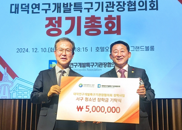 [충청뉴스큐] 대전 서구는 10일 신세계오노마호텔 5층 그랜드볼룸에서 대덕연구개발특구기관장협의회로부터 청소년 장학금 500만원을 기탁받았다고 밝혔다.