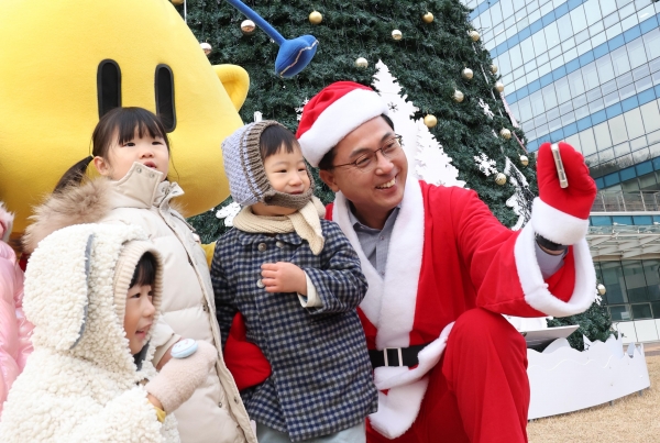 [충청뉴스큐] 산타로 깜짝 변신한 박희조 동구청장이 13일 구청 1층 잔디광장에서 한솔어린이집 원아들을 위한 선물 이벤트를 진행하며 특별한 추억을 선사했다.