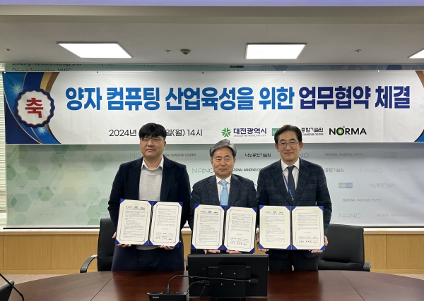 이날 협약식에는 한선희 대전시 미래전략산업실장, 노르마 정현철 대표, 나노종합기술원 박흥수 원장 등이 참석해 양자컴퓨팅 기술 발전과 상용화 지원을 위한 협력 의지를 다졌다.