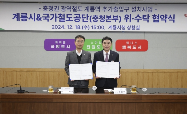 [충청뉴스큐] 계룡시는 18일 시청 상황실에서 충청권 광역철도 사업과 연계한 계룡역 추가출입구 설치사업의 효율적 추진을 위해 국가철도공단 충청본부와 위·수탁 협약을 체결했다고 밝혔다.