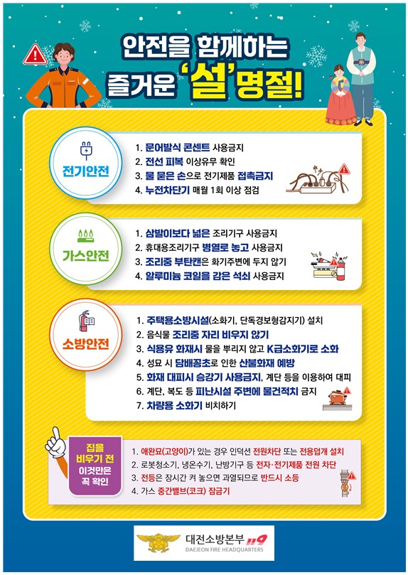 강대훈 대전시 소방본부장은 “모두가 안전한 설 연휴를 보내기 위해 시민 여러분께서 적극적인 관심을 두고 화재 예방에 동참해 주시길 바란다”고 당부했다.