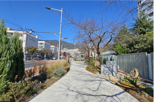 이에 ‘15분도시 부산’은 이곳의 규정보다 넓은 차도폭을 줄이고 보도를 확장해 당감천을 동기로 한국 정원형 보도를 디자인했다.