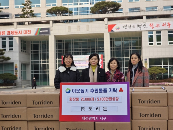 [충청뉴스큐] 대전 서구는 연말을 맞아 이웃사랑을 실천하기 위해 ㈜토리든으로부터 화장품 25,000개, 5,100만원 상당의 물품을 기증받아 지역 어려운 시설 및 어려운 환경의 가정에 전달했다고 31일 밝혔다.