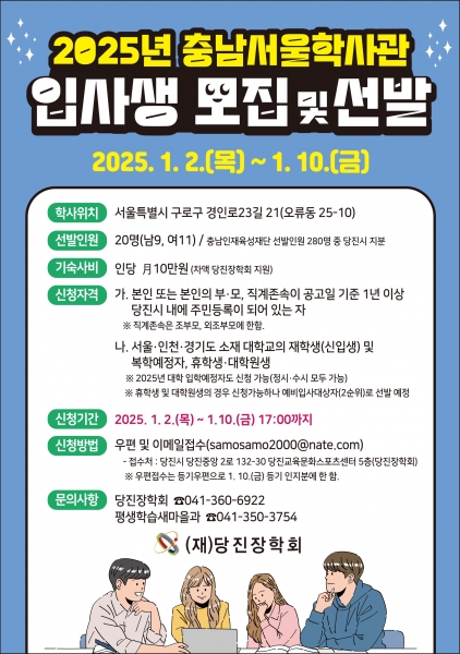 [충청뉴스큐] 당진시가 수도권 대학을 다니는 당진 지역 대학생을 대상으로 2025년 충청남도 서울학생기숙사 입사생 20명을 모집한다.