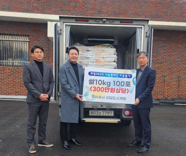 ㈜미담도시개발 이재상 대표는 “우리 주위의 어려운 이웃에게 조금이나마 도움을 전달하고자 새해를 맞이해 나눔을 실천했다”며 “앞으로도 나눔과 봉사를 이어가겠다”고 소감을 전했다.