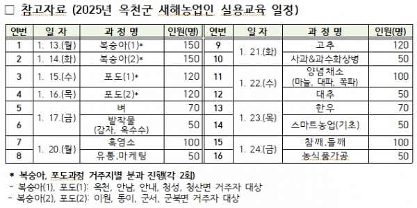 [충청뉴스큐] 옥천군농업기술센터는 오는 13일부터 24일까지 10일간 옥천군농업기술센터 농업인교육관에서 2025년 새해 농업인 실용교육을 실시한다고 10일 밝혔다.