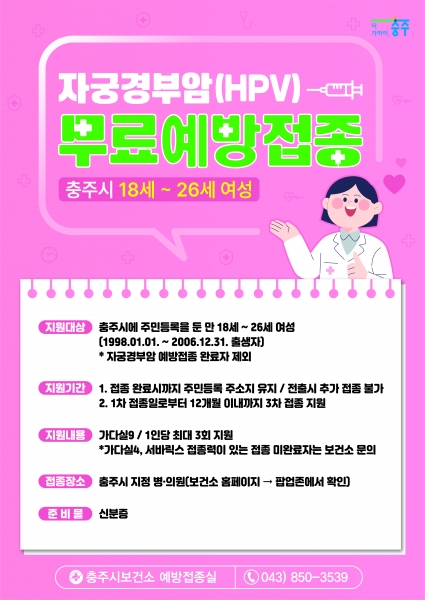 [충청뉴스큐] 충주시가 전국 지방자치단체 중 유일하게 자궁경부암 예방을 위한 ‘가다실9’ 예방접종 전액 지원 사업을 시행하며 여성 건강을 선제적으로 지켜나갈 계획이라고 밝혔다.