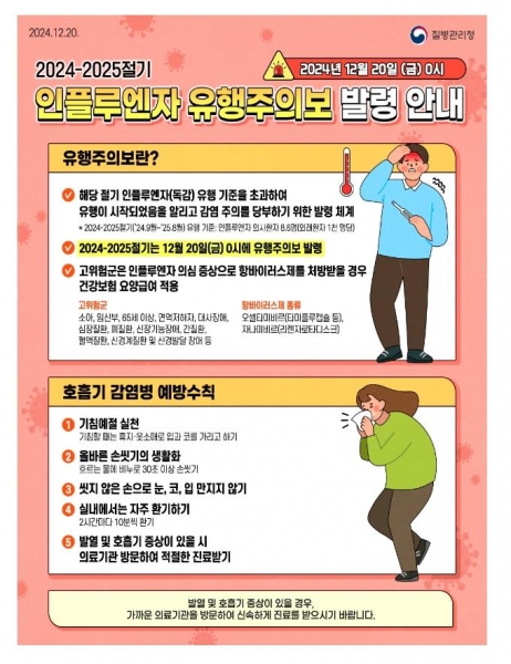 질병관리청은 지난해 12월 전국에 인플루엔자 유행주의보 발령 이후 모든 연령층에서 인플루엔자 환자가 증가하고 있으며 2025년 첫 주 인플루엔자 의사환자 발생은 1천 명당 99.8명으로 전주 73.9명 대비 35% 증가했다고 밝혔다.