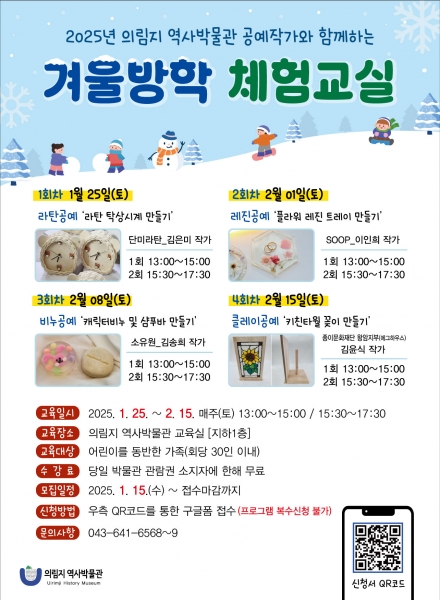겨울방학 체험교실은 선착순 접수마감으로 1월 15일 오전 9시부터 의림지 역사박물관 홈페이지 공지사항 게시판 혹은 박물관 SNS 등에 게시된 큐알 코드를 통해 신청하면 된다.