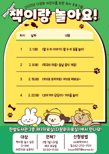 [충청뉴스큐] 대전 한밭도서관은 2월 1일부터 2월 22일까지 매주 토요일 다문화 독서 프로그램 ‘책이랑 놀아요’를 운영한다.