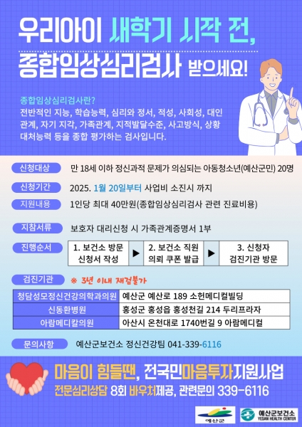 [충청뉴스큐] 예산군 정신건강복지센터는 올해도 아동·청소년기 정신건강 문제의 예방 및 조기 발견을 통해 건강한 사회구성원으로의 성장 발달을 지원하기 위한 종합임상심리검사비 지원 사업을 추진한다.
