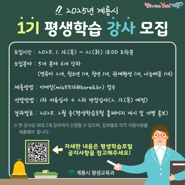 [충청뉴스큐] 계룡시는 2025년 1기 생애주기별 평생학습에 함께할 강사를 공개 모집한다고 밝혔다.