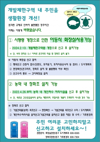 중구는 농막 내 임시거주 등을 위해 설치되는 전기설비의 노후로 인한 화재 예방 전수조사와 함께 개발제한구역법 개정사항을 주민들이 손쉽게 이해할 수 있도록 자체 제작한 안내문을 배포해 가설건축물 화재 예방법 및 이동식 화장실 신고 절차, 농막 내 정화조 설치에 대한 신고 절차도 안내할 예정이다.