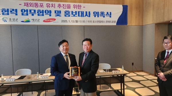 [충청뉴스큐] 예산군은 지난 13일 미국 LA 현지에서 재외동포 역이민 유치를 위한 첫단추로 충남도, 예산군, 홍성군, 미국 레드포인트그룹 등과 함께 업무협약을 체결했다.