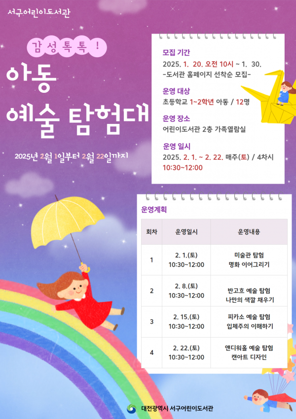 이번 프로그램은 아동의 상상력, 감정표현력을 높이는 것은 물론 예술적인 시각으로 세상을 바라보고 자아 성장을 도모할 수 있도록 다양한 예술가들과 관련된 그림책과 예술 작품을 활용한 수업이 진행된다.